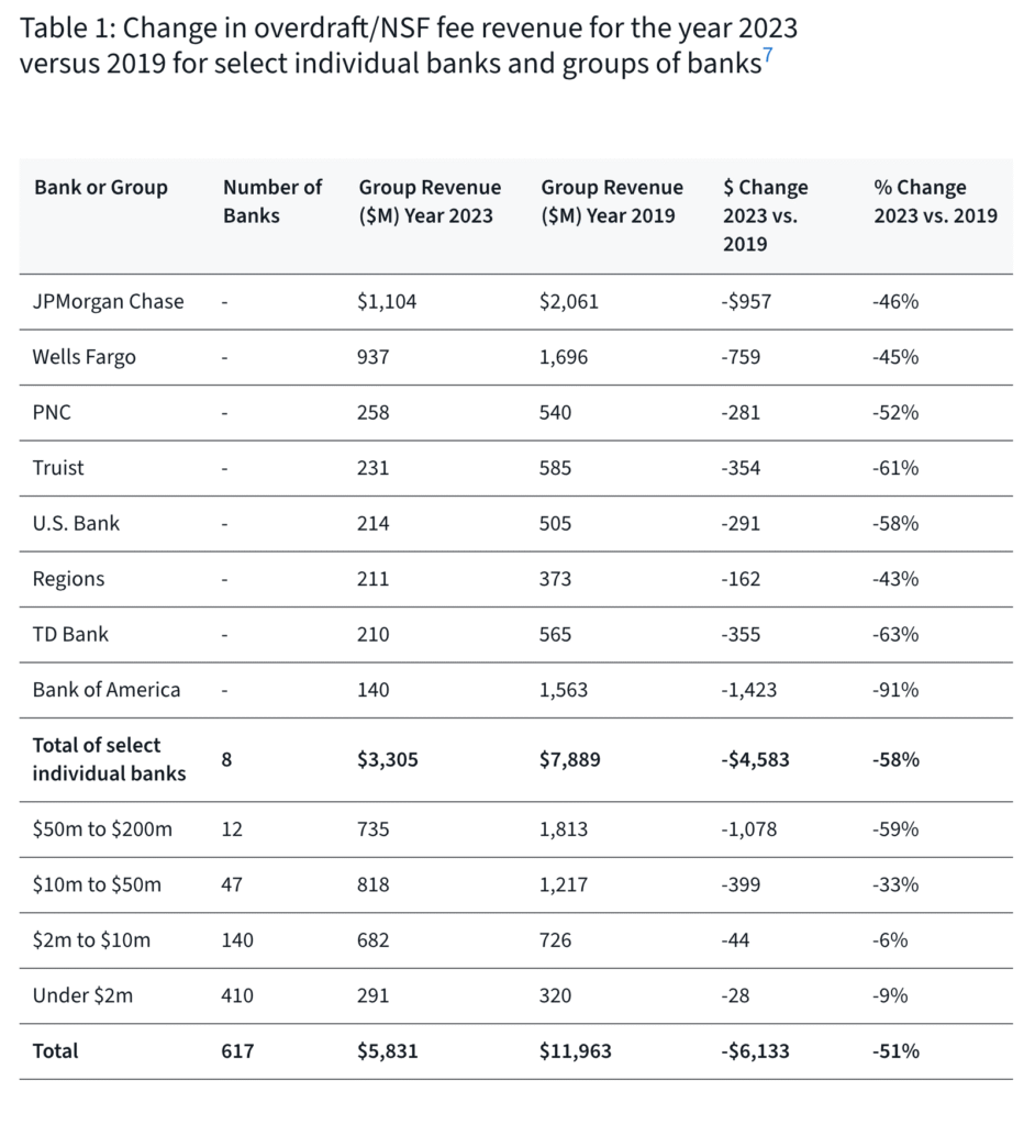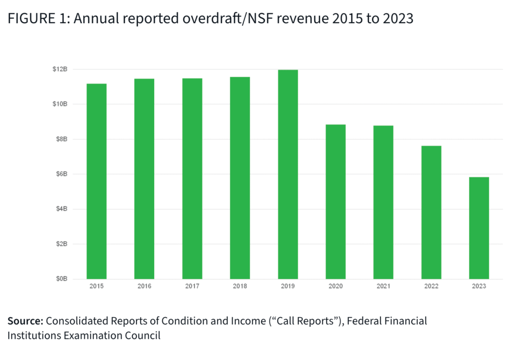 (Figure below) shows annual U.S. overdraft/NSF fee revenue by year. It fell from ~$12B in 2019 to $5.8B in 2023. The drop reflects policy changes, but note that $5.8B is still a large “tax” on consumers.